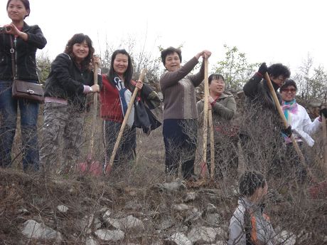 | 到了場(chǎng)地后,各位老師迅速開始了熱鬧朝天的植樹活動(dòng)。 | 每位老師一棵樹,種下自己的愛心樹。 |