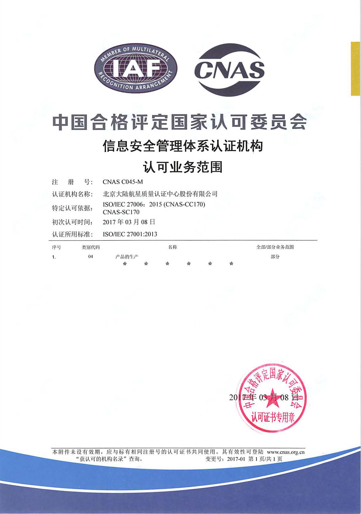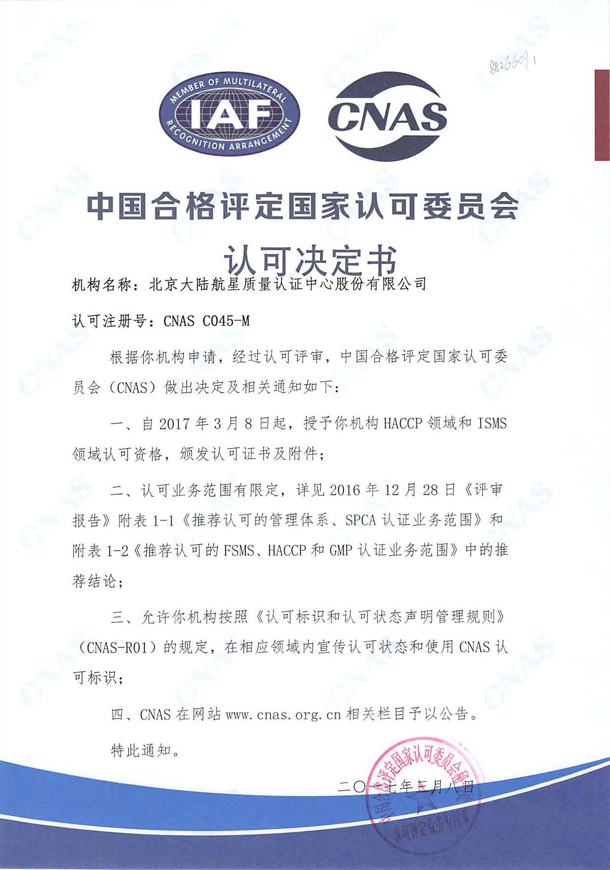 201738日北京大陸航星質(zhì)量認(rèn)證中心股份有限公司(以下簡(jiǎn)稱HXQC),順利通過(guò)中國(guó)合格評(píng)定國(guó)家認(rèn)可委員會(huì)(CNAS)信息安全管理體系(ISMS)和危害分析與關(guān)鍵控制點(diǎn)(HACCP)領(lǐng)域初次認(rèn)可,授予我公司HACCP領(lǐng)域和ISMS領(lǐng)域認(rèn)可資格,并換發(fā)了認(rèn)可證書。